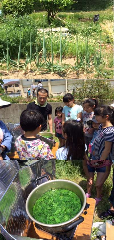 お餅を作る前に富澤さんより今日の活動の手順の説明があり、その後子ども達も一緒に、エンドウ豆の収穫、畑の畝作り、夏野菜(こつまなんきん、毛馬きゅうり等)の苗を植えました。