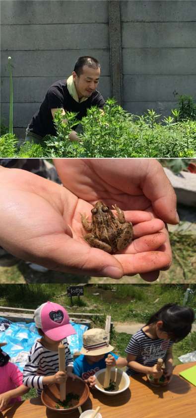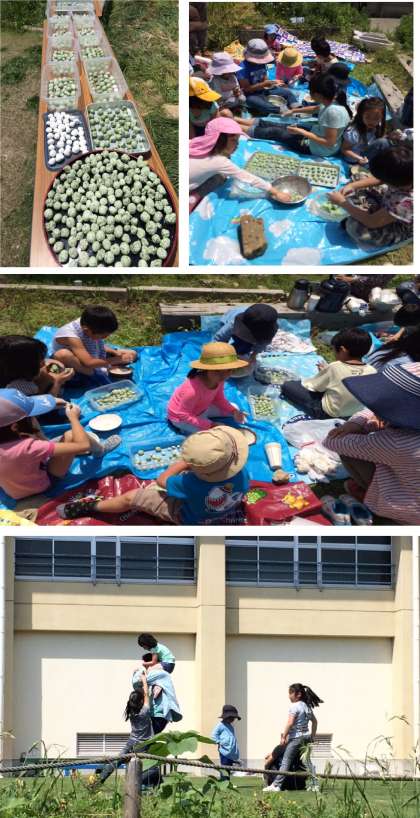 お餅の準備や作る手順も年々要領を得て、着々とお餅作りが進みます。出来上がりが待ち切れず「お腹すいたー!」と言っていた子ども達も、きなこたっぷりのよもぎ餅を5回もおかわり出来て満足気な様子でした。お餅の後はパスタをゆがき、難波ネギのネギボウズと収穫したばかりの玉ねぎを入れてトマトソースであえ「難波ネギパスタ」をいただきました。ネギの苦みもなく子どもも食べやすい美味しいパスタでした。お腹が一段落したら、学生のお兄さんお姉さんらと芝生の上で転がったり、おんぶしてもらったり、身体いっぱい使って遊ぶ子、また三星さんが沢山ビーズを持ってきて下さり、色々な形のビーズを選んで糸に通してアクセサリー作りに夢中になる子等、1日たっぷり遊びきった子ども達でした。