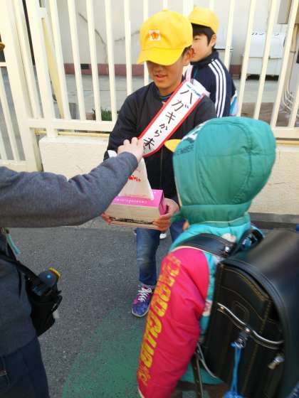 児童会の子どもたちが、回収箱をもって登校時に回収しています。