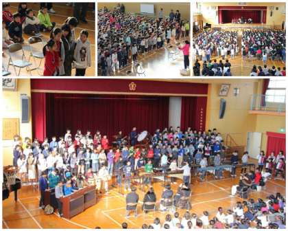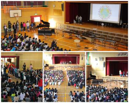 ウェルカムセレモニーでは日本と中国の曲を歌ったり、合奏をしたりして歓迎の気持ちを表しました。また、中国の児童生徒からあいさつもありました。