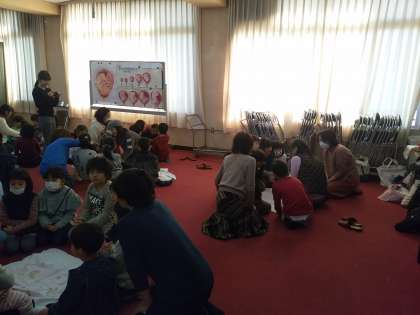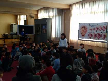 この授業は毎年「いのちのわあべの」のみなさんと募集にこたえていただいた妊婦さん・赤ちゃんとお母さん、お手伝いしていただいた保護者のみなさんで「いのち」ついて考えるきっかけとなる授業をしていただいています。