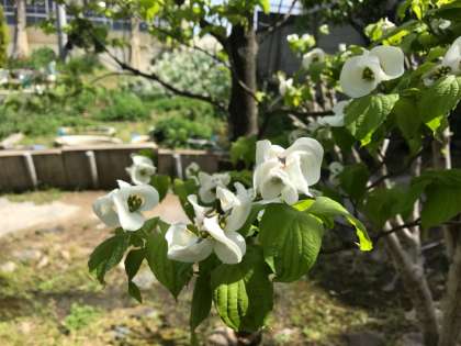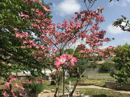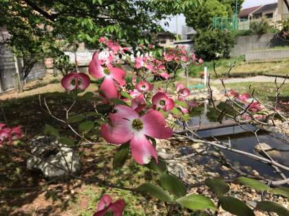 自然観察園や玄関のハナミズキが美しく開花しました。花言葉は