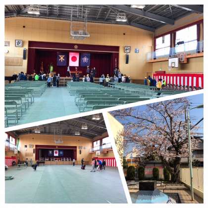 平成31年4月4日(木)、明日の入学式に向けて新6年生が登校し、体育館にパイプ椅子を並べる作業をしてくれました。また、玄関周辺等の掃除も行い、明日の入学式に向けての準備が整いました。