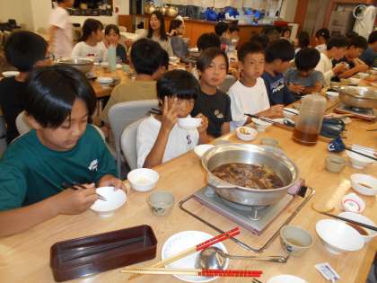 今日は、朝早くから山登り・野外炊飯・焼き板づくりと行事が続いたので、みんなおなかはペコペコ。おかわりもどんどん進みます。