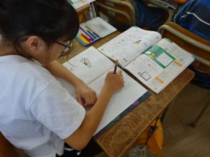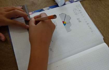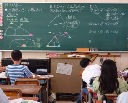 三角形の内角の和が180度になることを、実際に図形を切り離して1点に角を集める操作を通して確認しています。