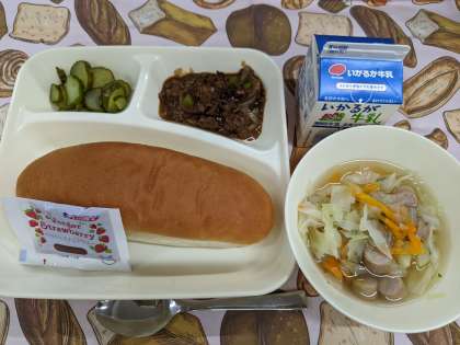 9月10日(水)の給食は「牛肉のデミグラスソース煮、ウインナーのスープ、きゅうりのピクルス、コッペパン、いちごジャム、牛乳」です。
