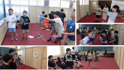 理科「とじこめられた空気や水」では、空気てっぽうを使って実験をおこなっています。