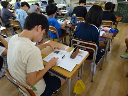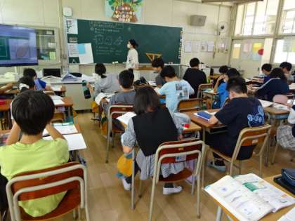 これまで学習してきた、正方形・三角形・円の面積の求め方を使って、特殊な形(ラグビーボール形)の面積をどのように求めればよいかを考えていました。