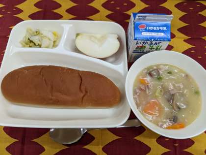 10月3日(金)の給食は「鶏肉とさつまいものシチュー、はくさいのピクルス、りんご、黒糖パン、牛乳」です。