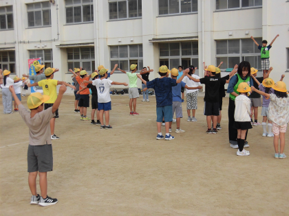 三番目の腕をまわす運動は「ひじが曲がらないようにのばしながらおこなうこと」と教えてくれました。動きのポイントを意識して体操することができました。