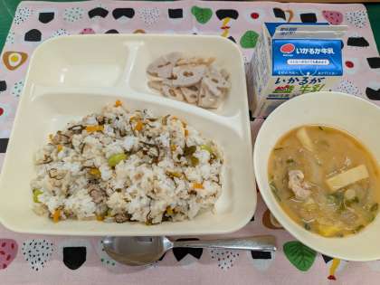 10月21日(火)の給食は「もずくと豚ひき肉のジューシー〈大豆除去食〉、じゃがいものみそ汁、焼きれんこん、牛乳」です。