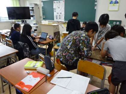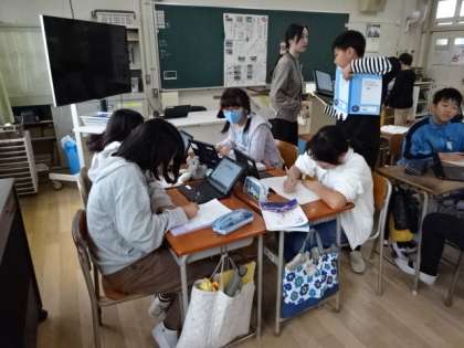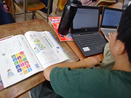 6年生は、SDGSの取組について、タブレットPCで情報を集め、まとめていました。友だちと意見を交流しながら学習を進めていました。