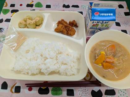 10月22日(水)の給食は「とり天、どさんこ汁、抹茶だんご(きな粉)、ごはん、牛乳」です。