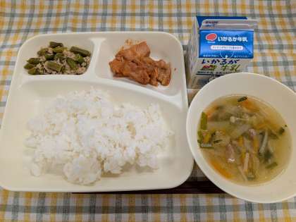 10月29日(水)の給食は「鶏肉のチリソース焼き、焼き豚のスープ、ツナとさんどまめのいためもの、ごはん、牛乳」です。