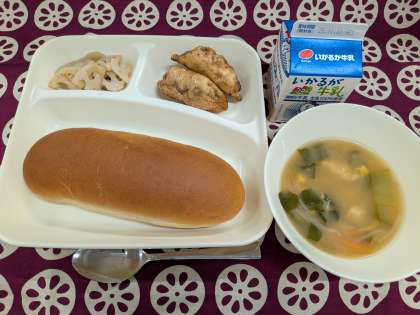 11月4日(火)の給食は「あげギョーザ、中華みそスープ、れんこんの中華だれかけ、黒糖パン、牛乳」です。