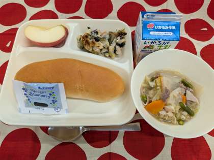 11月11日(火)の給食は「ほうれんそうのグラタン、てぼ豆のスープ煮、りんご、コッペパン、ブルーベリージャム、牛乳」です。