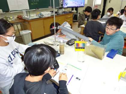 粒の大きさで水の中を運ばれる速度が違い、そのことで層ができていく様子を観察していました。