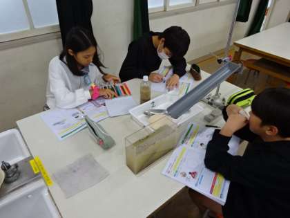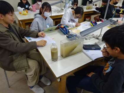 6年生が、理科で小石や砂、泥などを混ぜた水を使って、地層のでき方の実験をしていました。