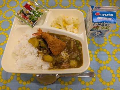 11月13日(木)の給食は「えびフライカレーライス、カリフラワーのピクルス、豆こんぶ、牛乳」です。