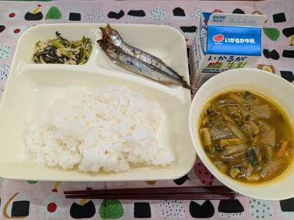 11月27日(木)の給食は「焼きししゃも、和風カレー汁、ささみとこまつなのいためもの、ごはん、牛乳」です。