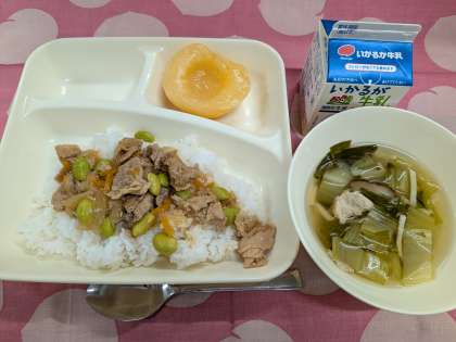 11月28日(金)の給食は「ピリ辛丼〈大豆除去食〉、中華スープ、白桃(缶)、牛乳」です。