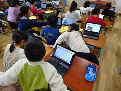 1年生の子どもたちが、自然観察学習園で今の季節の様子が感じられるものをタブレットで撮影し、まとめていました。