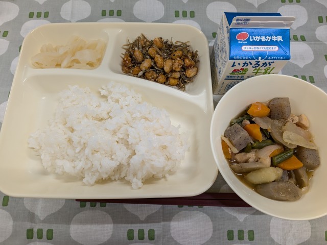 12月5日(金)の給食は「鶏肉と野菜の煮もの、じゃこ豆、かぶのゆず風味、ごはん、牛乳」です。