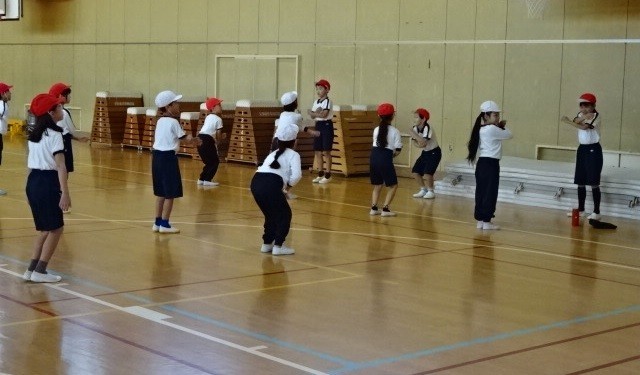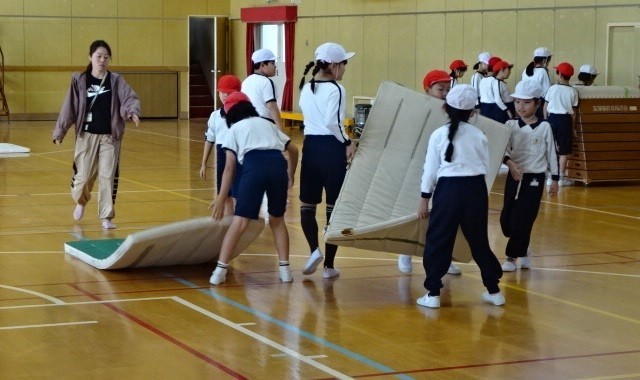 ラジオ体操で体をほぐしてから、先生の指示で跳び箱運動の準備をしていました。