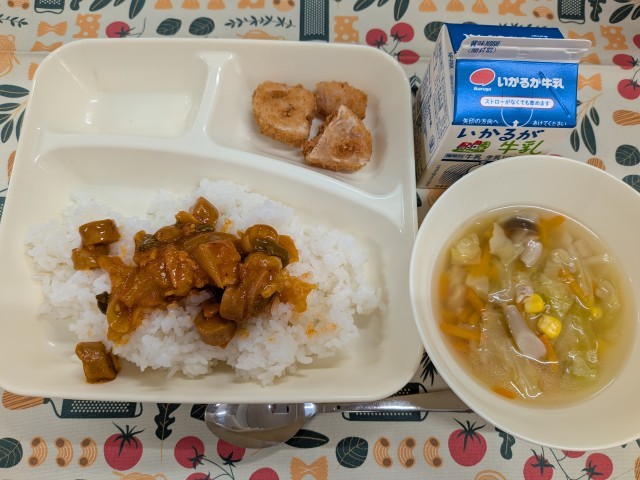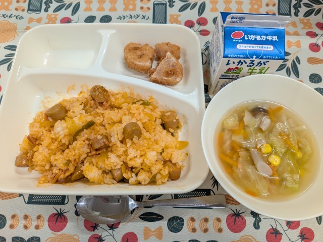 12月18日(木)の給食は「ケチャップライス、スープ、れんこんフライ、牛乳」です。