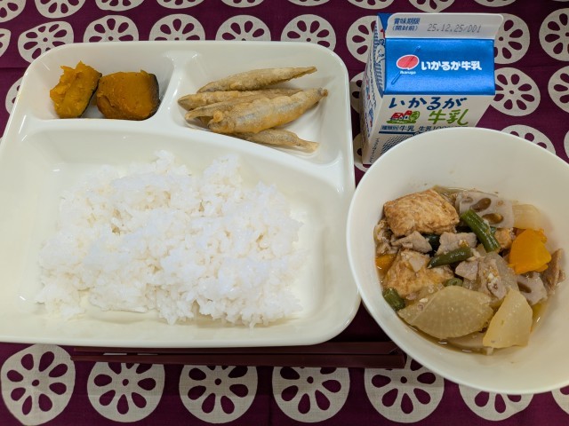 12月19日(金)の給食は、「きびなごてんぷら、豚肉とあつあげの煮もの、焼きかぼちゃの甘みつかけ、ごはん、牛乳」です。