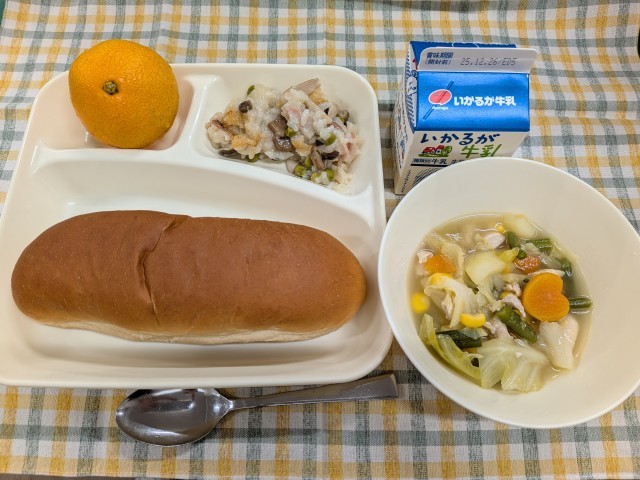 12月22日(月)の給食は、「きのこのドリア、鶏肉と野菜のスープ煮、みかん、黒糖パン、牛乳」です。