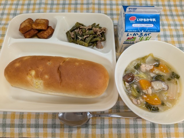 1月9日(金)の給食は、「はくさいのとろみ煮、豚肉とさんどまめのオイスターソースいため、あつあげのピリ辛じょうゆかけ、おさつパン、牛乳」です。