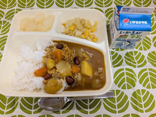 1月13日(火)の給食は、「豚肉と金時豆のカレーライス、サワーソテー、和なし(缶)、牛乳」です。