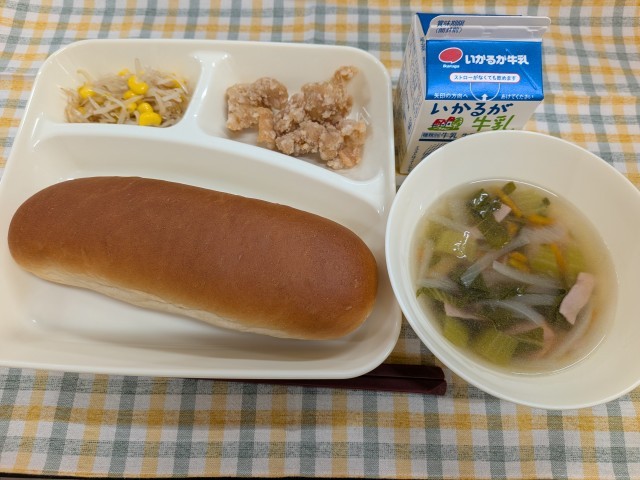 1月15日(木)の給食は「鶏肉のからあげ、ハムとやさいの中華スープ、もやしとコーンの中華あえ、黒糖パン、牛乳」です。
