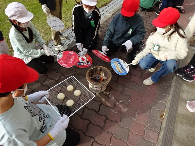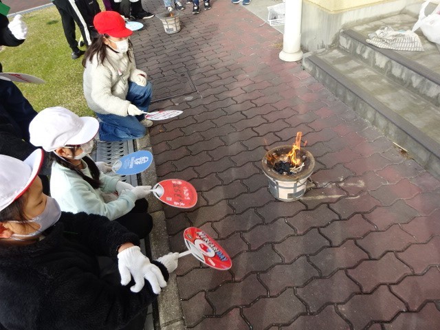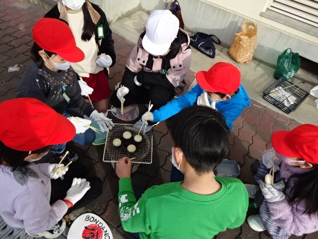 おこした炭火で、おもちを焼くのですが、みんな無事に食べることはできたかな。