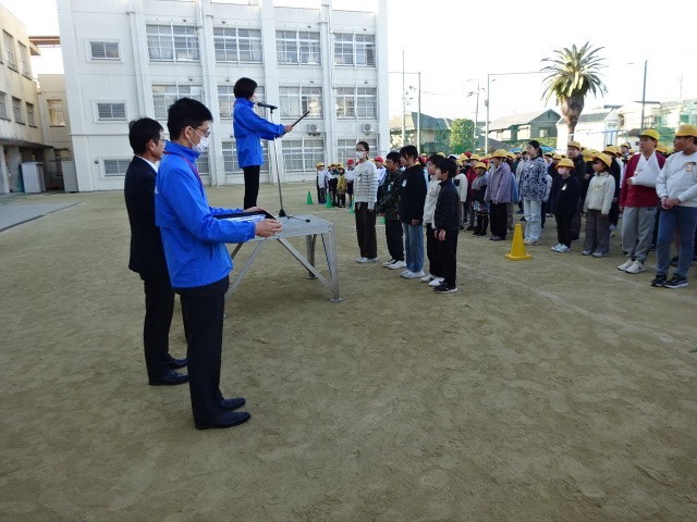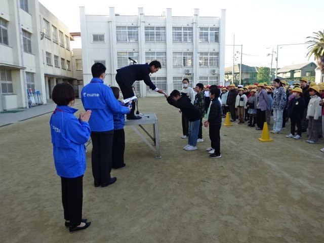 かんぽ生命の方と地域の郵便局長さんが来られ、水曜日の児童集会の時間に表彰してくださいました。