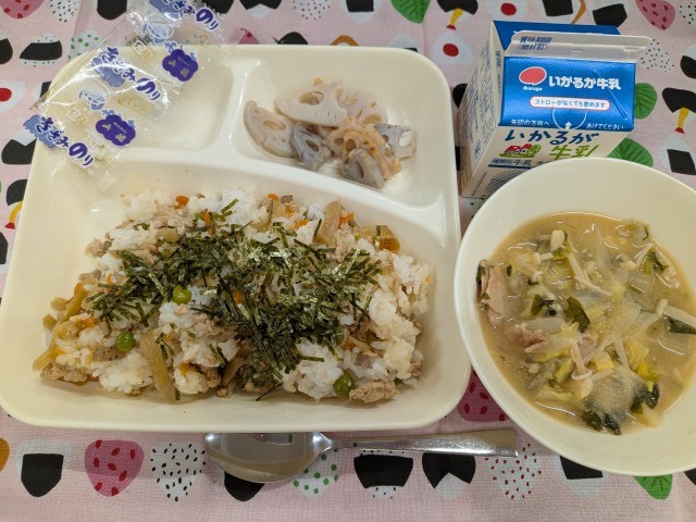 2月10日(火)のこんだては、「鶏ごぼうご飯、みそ汁、焼きれんこん、牛乳」です。