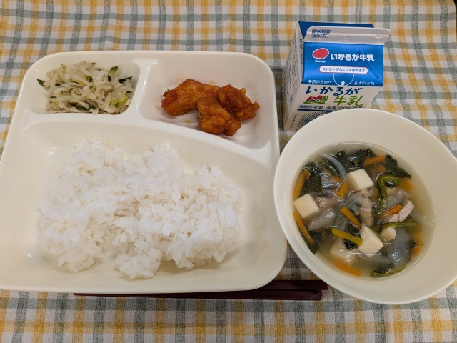2月12日(木)のこんだては「ヤンニョムチキン、とうふのスープ、切干しだいこんのナムル、ごはん、牛乳」です。