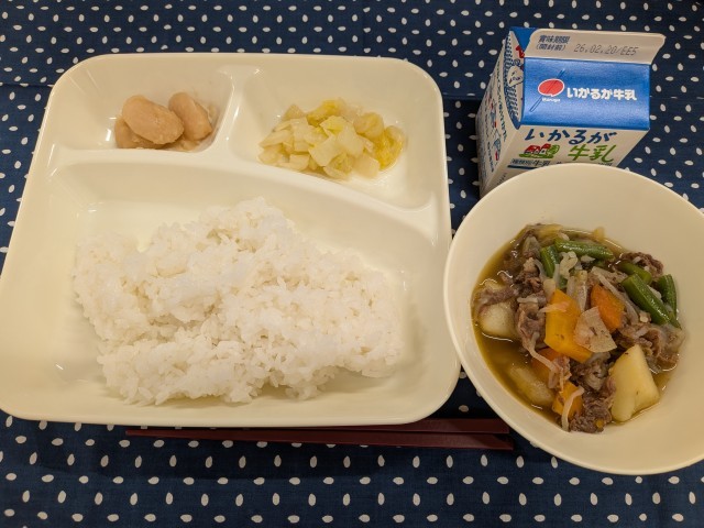 2月16日(月)のこんだては「肉じゃが、はくさいのゆず風味、白花豆の煮もの、ごはん、牛乳」です。