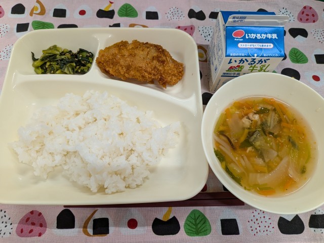 2月18日(水)のこんだては「たらフライ、うすくず汁、こまつなのごまあえ、ごはん、牛乳」です。