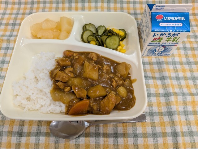 2月19日(木)のこんだては、「チキンレバーカレーライス、きゅうりとコーンのサラダ、洋なし(缶)、牛乳」です。