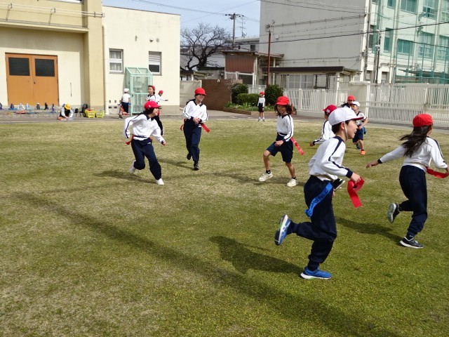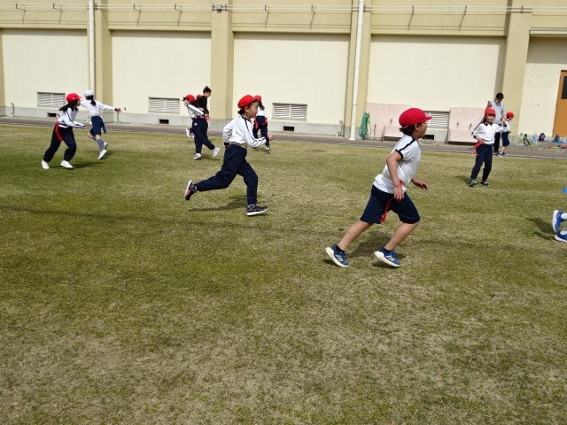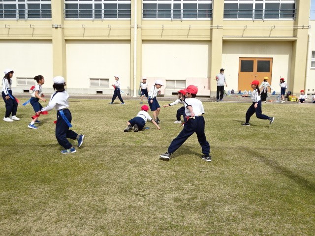 腰に2本のタグをつけて、赤と青に分かれて取り合いをしました。