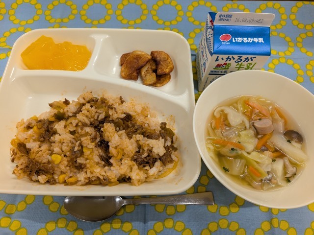 3月3日(火)のこんだては「ビーフケチャップライス、フライドポテト、キャベツのスープ、みかんゼリー、牛乳」です。6年生の卒業をみんなでお祝いする【卒業祝い献立】です。
