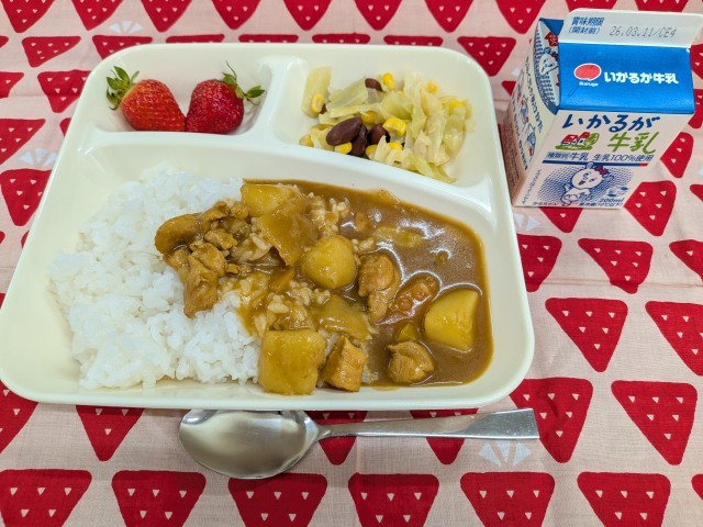 3月5日(木)のこんだては、「チキンカレーライス、金時豆と野菜のサラダ、いちご、牛乳」です。
