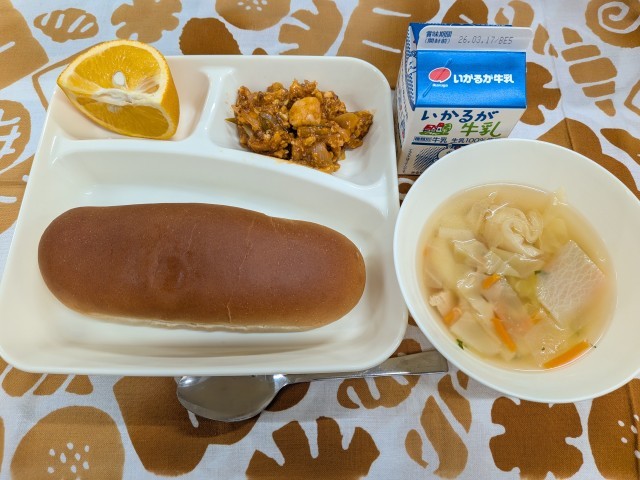 3月11日(水)のこんだては「とうふのミートグラタン、じゃがいもと野菜のスープ、はっさく、黒糖パン、牛乳」です。