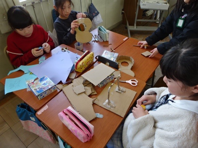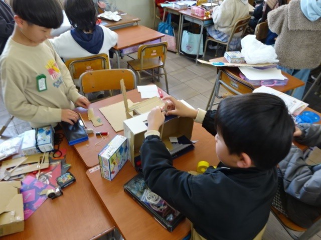 理科の時間に学習したこと「音の伝わり方」「電気の通り道」「磁石のはたらき」などを使って、おもちゃ作りをしていました。