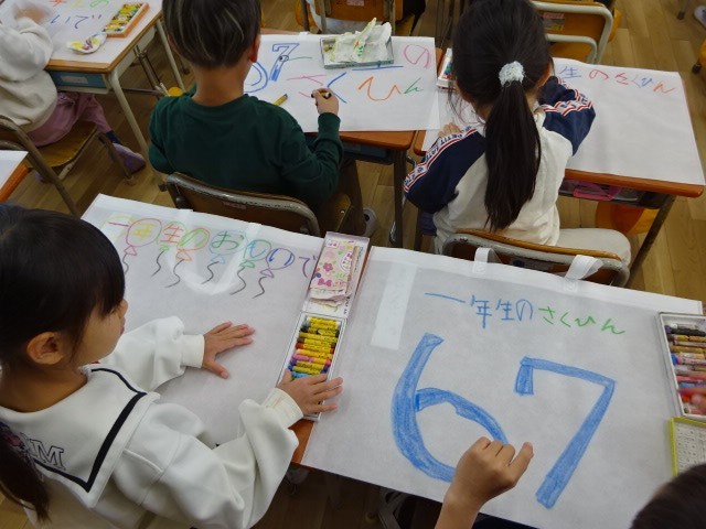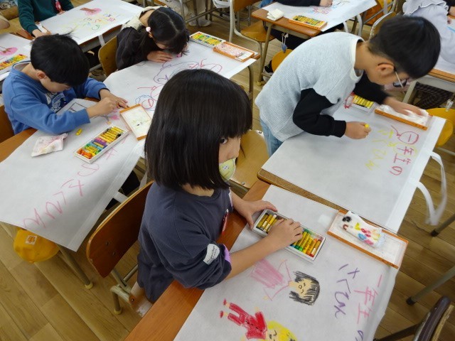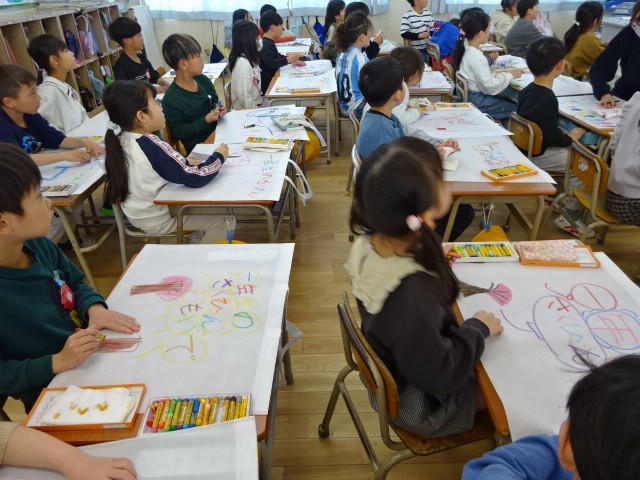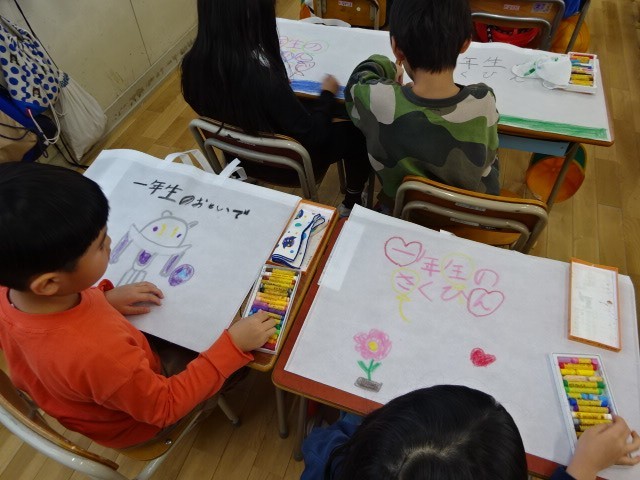 1年生が、1年間図画工作などでかいた作品などを持ち帰る袋に、自由にかきたい絵をかいていました。これが最後の作品になるかな。