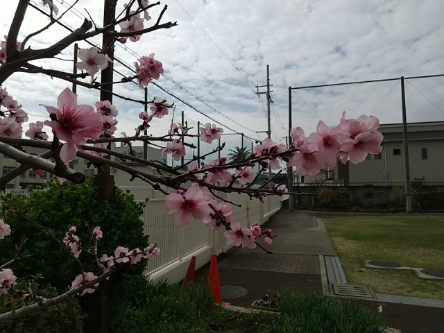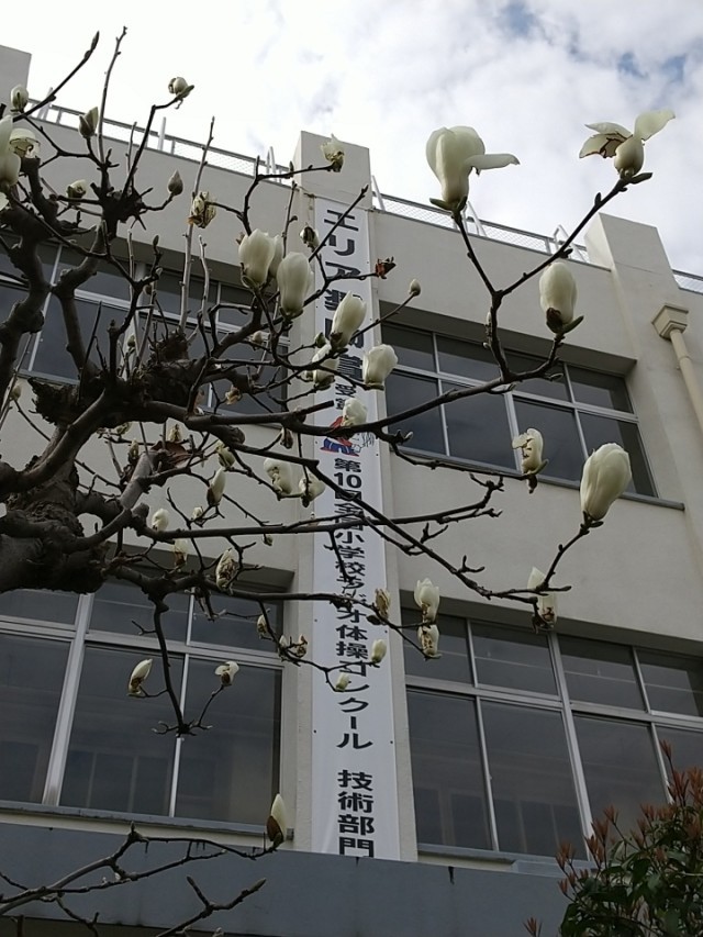 玄関前のハナモクレン、体育館前の花壇のアーモンドが花を咲かせ始めました。