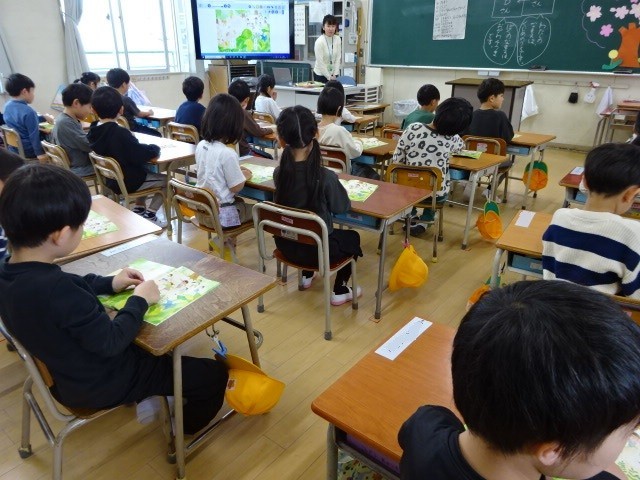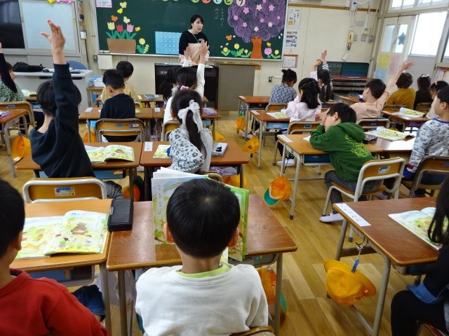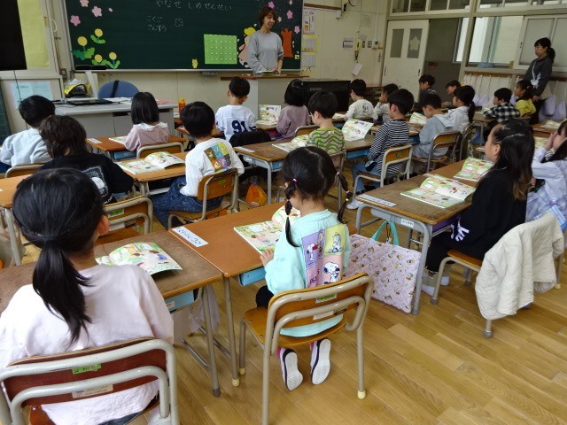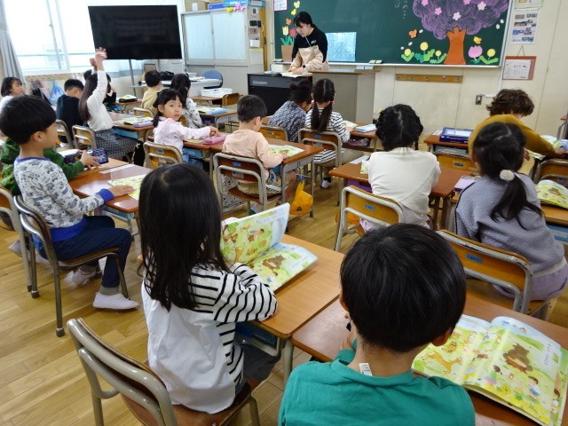 開いたページの絵を見ながら、何がえがかれているかを子どもたちに聞きながら授業を進めていました。