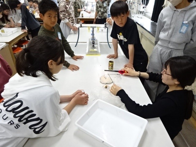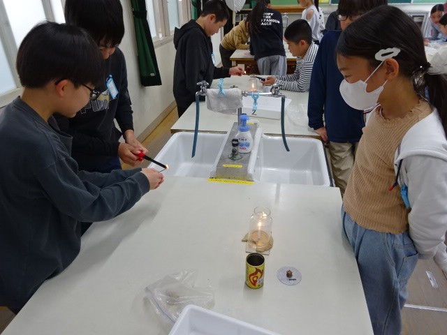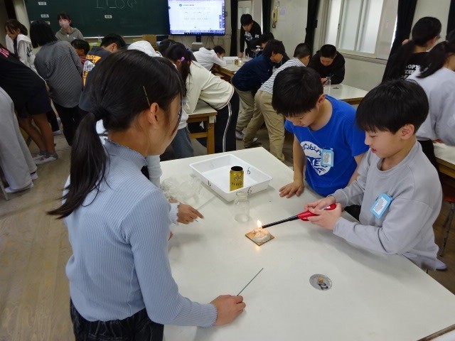 今日は、広口びんの中でろうそくを燃やした時、空気はどのように流れるのかを実験で確かめていました。